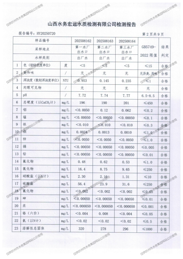 忻州城區(qū)公共供水水源水、出廠水、管網(wǎng)水、管網(wǎng)末梢水2025年8月份水質(zhì)信息公示
